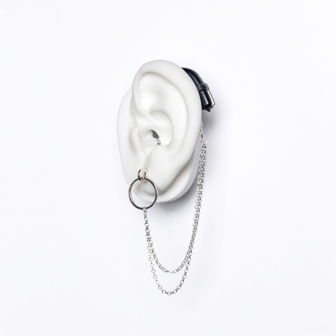 Diseñado para dar una apariencia vanguardista a cualquiera que use audífonos o implantes cocleares, el Biker Deafmetal tiene un diseño de aro sujeto a una cadena plateada, como se muestra. El cierre es de color plateado más oscuro para darle un aspecto dimensional. ¡Nos encanta este Deafmetal!