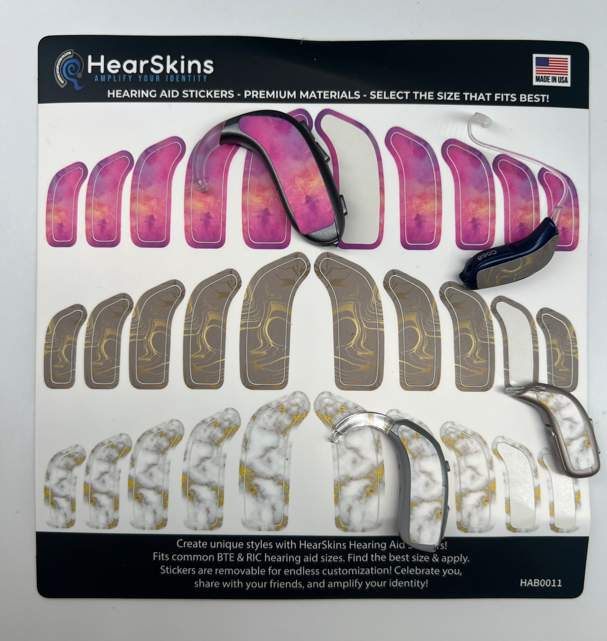 Convient aux tailles d'aides auditives BTE et RIC. Conçu universellement – Trouvez la meilleure taille et appliquez. Amovible pour une personnalisation sans fin. Célébrez-vous, partagez avec vos amis et amplifiez votre identité !