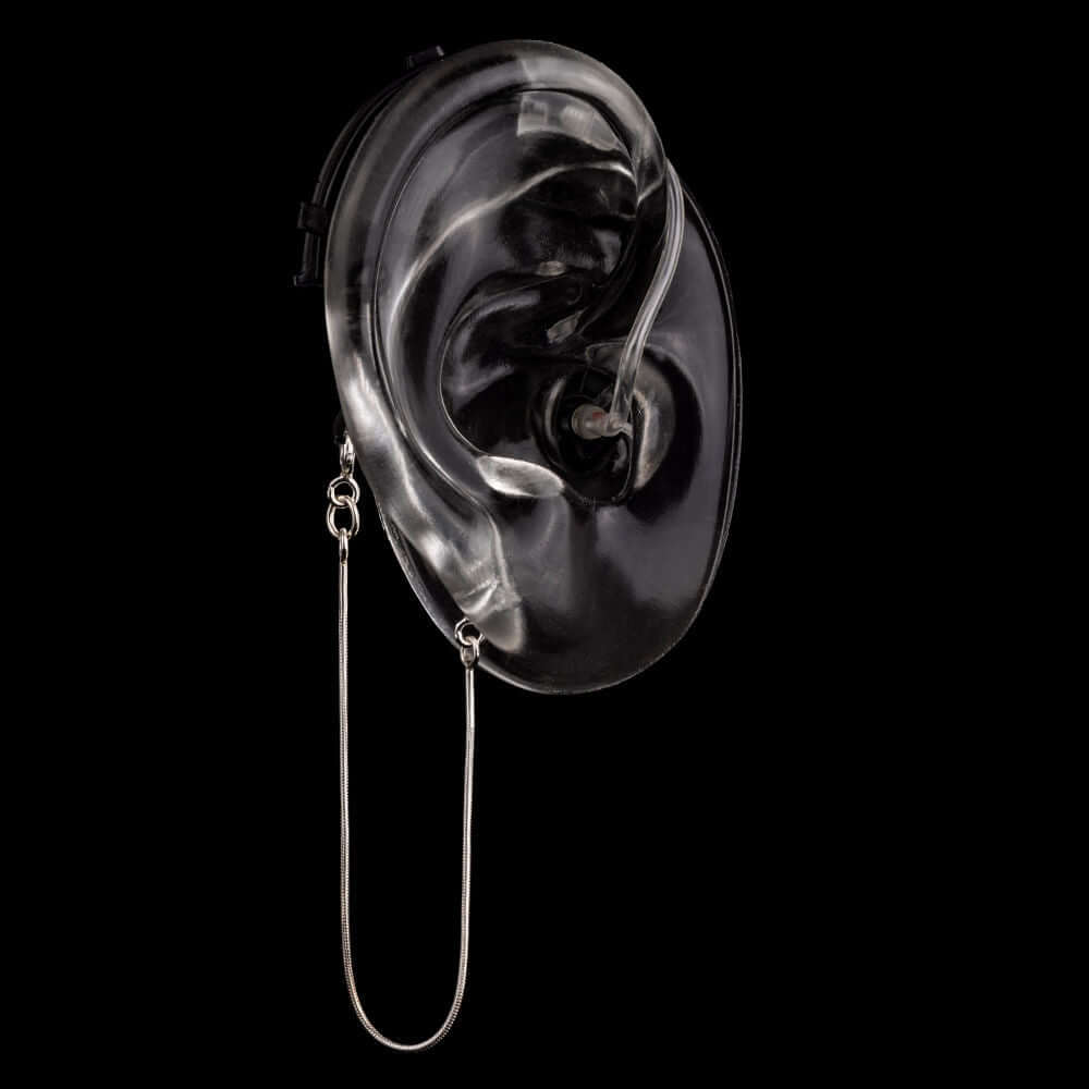 Our Safety chain collection is a great way to add some extra retention and a sleek look while at the same time adding extra security to your hearing device. These can be worn for all behind the ear hearing devices as well as off the ear cochlear implants with the appropriate attachments (holster for HA or BTE processor and other fasteners for off the ear CI). These snake chains are 7 cm long with one end attaching to the holster/fastener and the other end attaching to your own earring back to create your own unique pair of Deafmetal earrings.