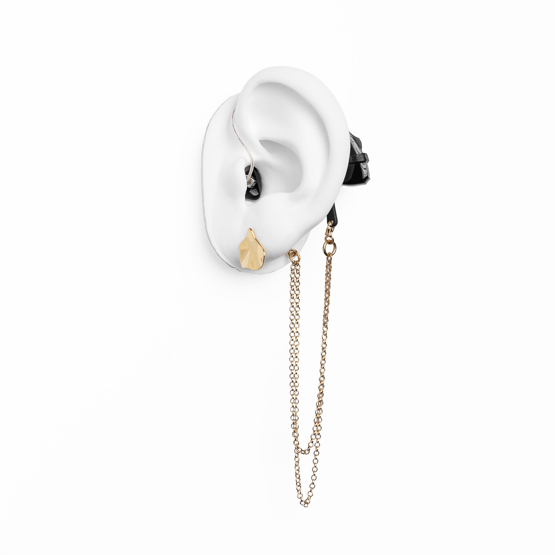 This golden Deafmetal earring adds a touch of elegance and style to your look! Beauty of Lump is a golden Deafmetal with an irregularly-shaped earring and a detachable double safety chain. It's a perfect blend of function and beauty, enhancing confidence while keeping hearing aids secured.