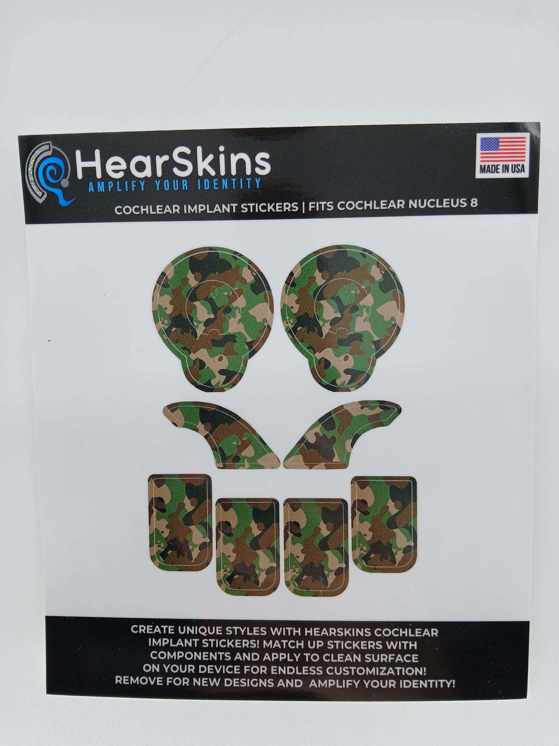 Camo designs have become a popular choice for fun and stylish accents. It can be worn by people of all ages. These Hearskins are specifically designed to fit either the cochlear Nucleus 7 or 8 (choose which one when ordering) , simple peel the stickers, line it up on your CI components and stick on - its that simple!