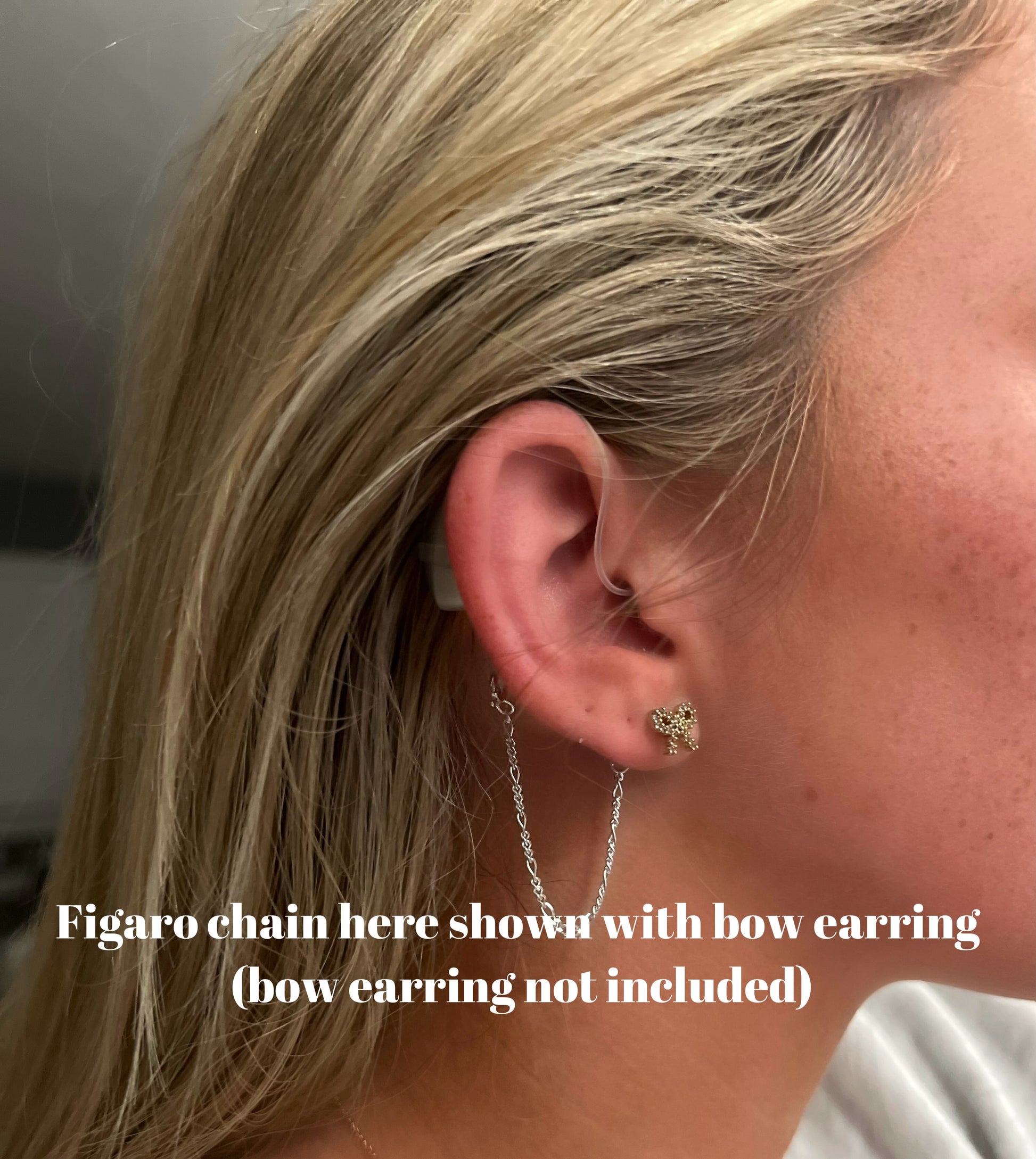 Our beautiful Figaro Chain is now available in the 7 cm "safety chain" with clasps on both ends so that you are able to attach these safety chains to your own favorite pair of earrings! A beautiful way to accessorize your hearing device while at the same time, providing extra security and fashion while wearing your hearing device.