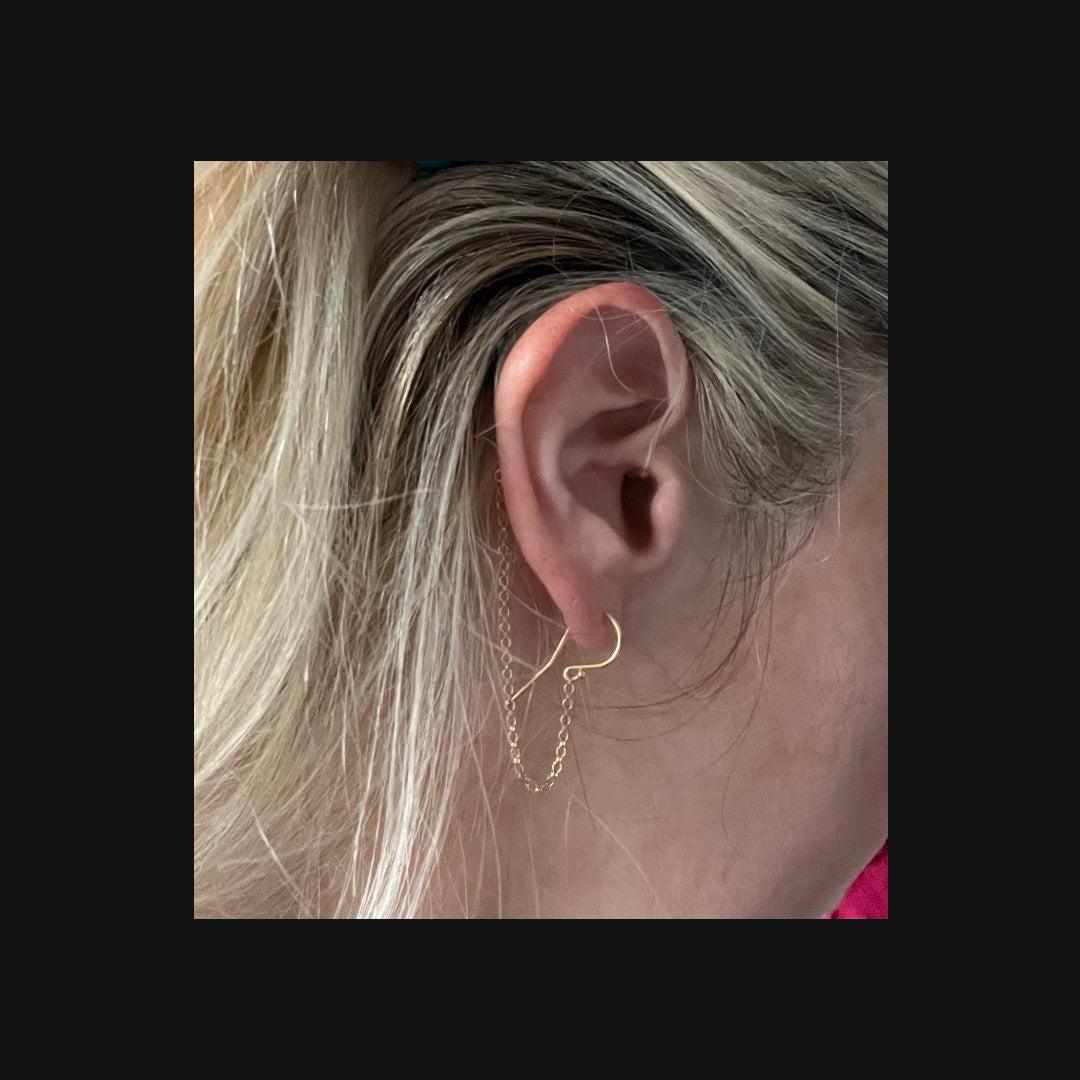 These 7 cm chains with french wire "hook" create a simple way to keep hearing devices attached and secure. Now available in 3 colors - silver, electroplated gold or electroplated black! Simply attach one clasp to the holster (not included) and then attach the hook to your pierced ear. Jewelry is sterling silver and nickel free.