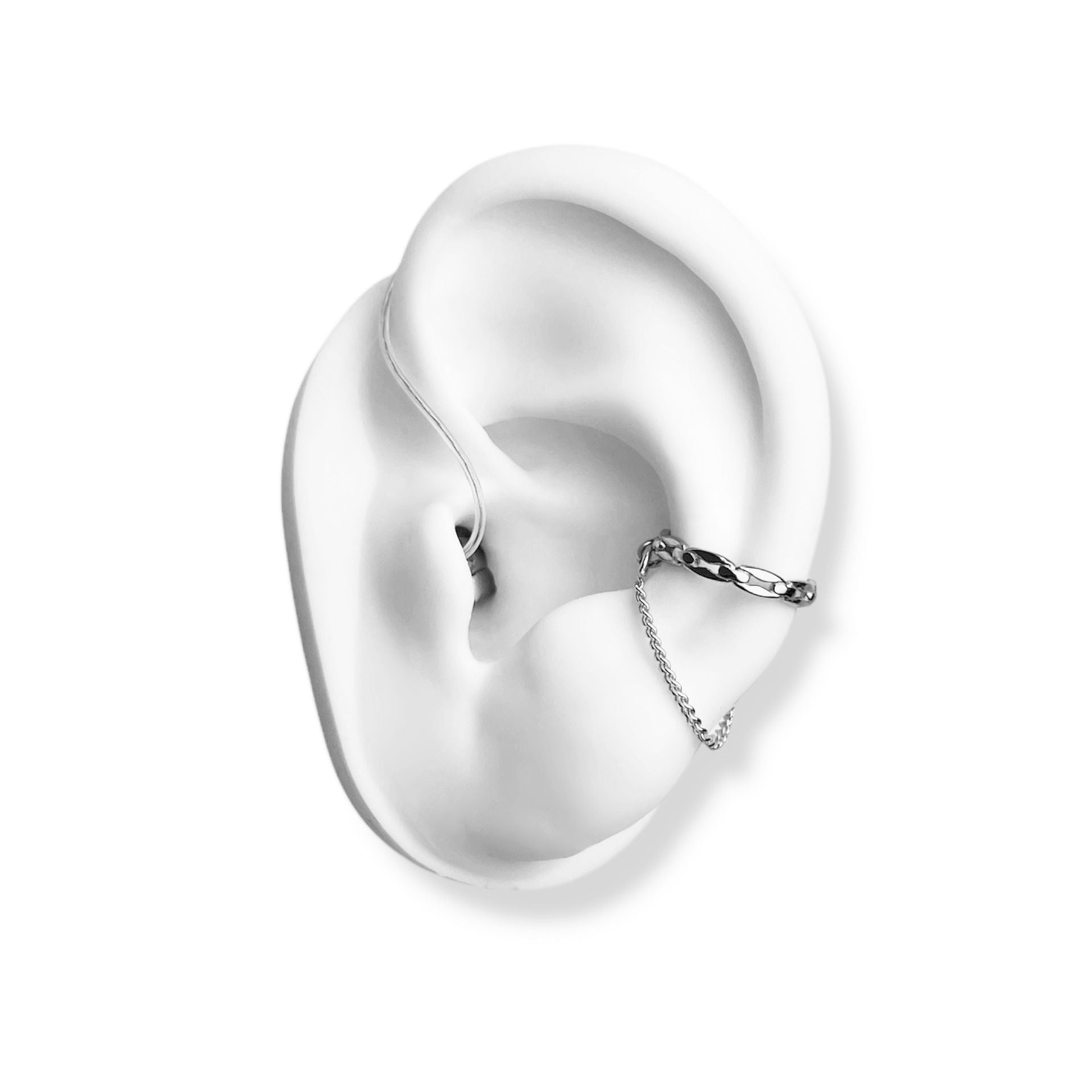 The Sailor Deafmetal cuff is what keeps your device secure—while the chain is all about edge and style ✨ The Sailor anchor cuff does the work, the chain does the talking—adding a bold, stylish touch to your hearing aid look. Available in 18k plated gold over silver or silver. Cuff attaches to the holster (sold separately) via a clasp as shown. Cuff is adjustable to widen for any size ear - NO PIERCING REQUIRED.