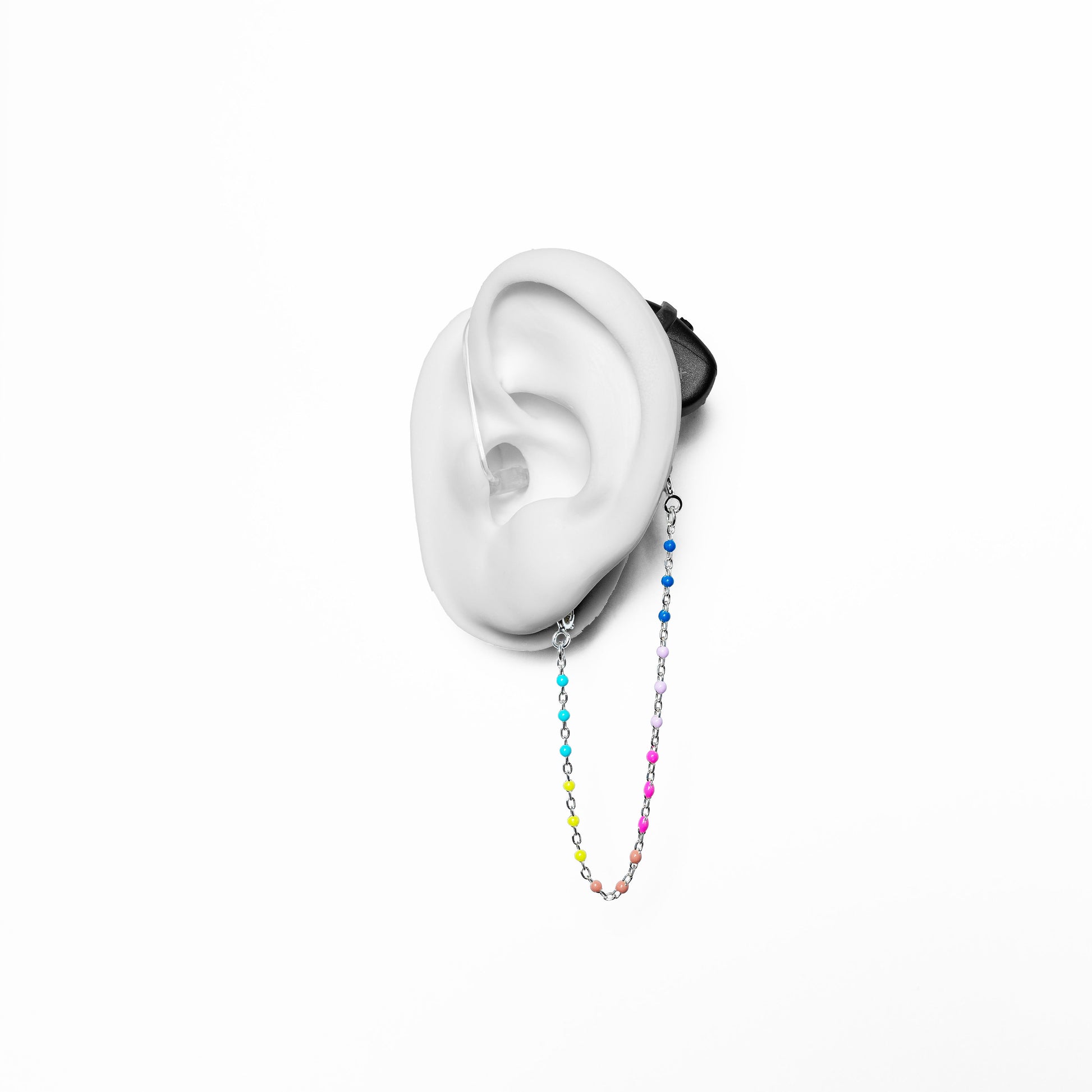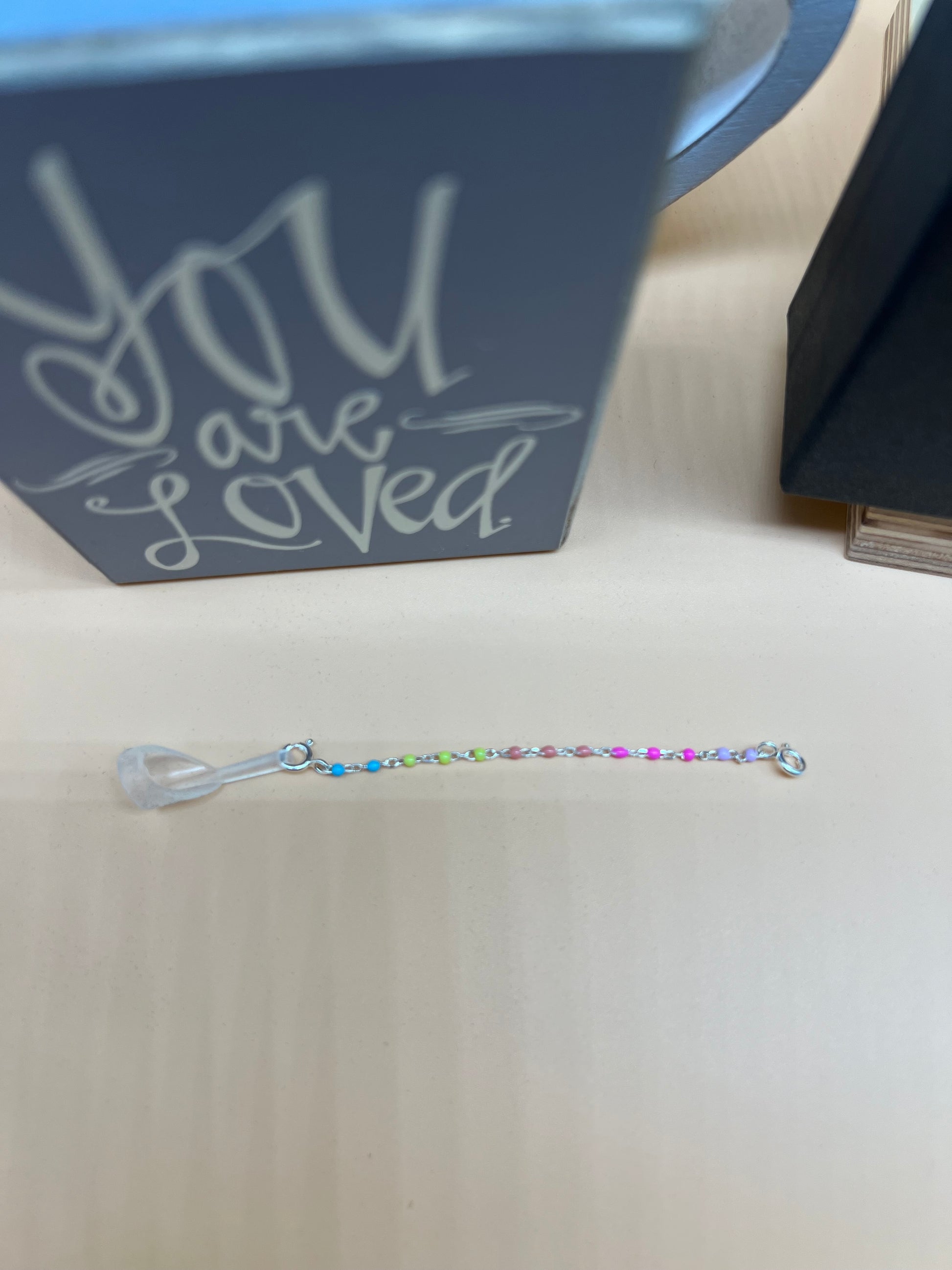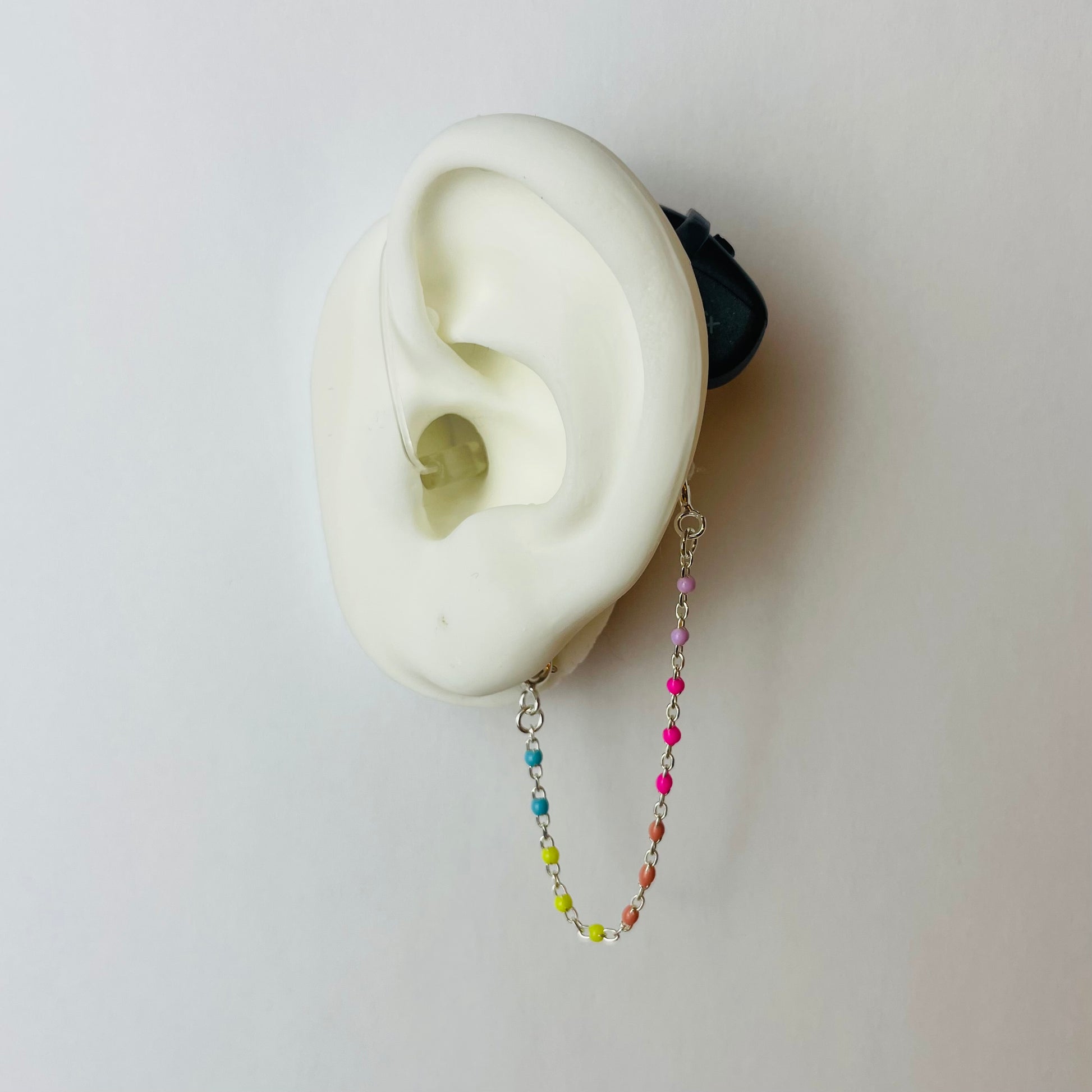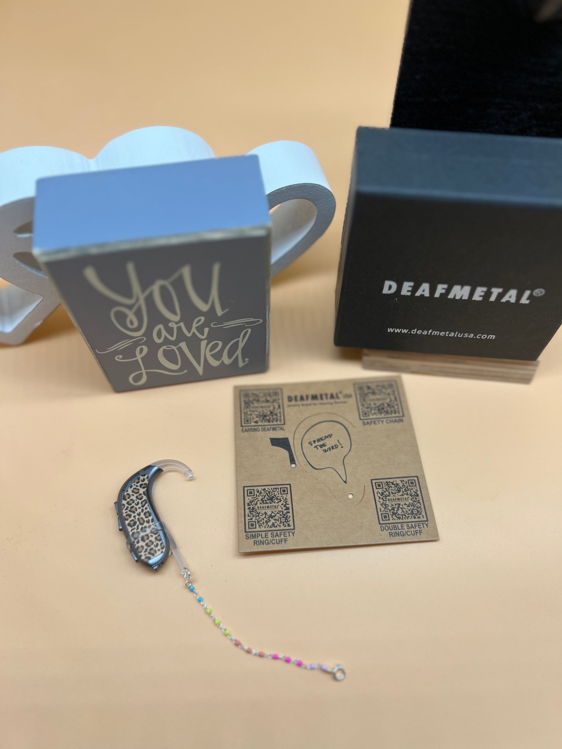 "You are Loved" colorful safety chains were designed with retention in mind as our safety chains keep hearing devices safe from falling to the floor. The silver chain comes in two sizes and measure 7 cm or 10 cm long. One end attaches to the holster (not included) and the other end attaches to your earring back to create your own unique Deafmetal! Can be attached to a holster and also can be attached to a baha hook, ojoint for Rondo and cochlear tube for off the ear cochlear products. See our fastener section to choose the correct fastener for your hearing device.